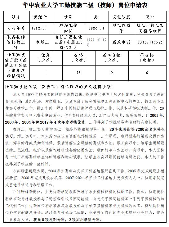 根据校发文件《关于开展工勤技能二级(技师)岗位聘用工作的通知》的要求,经教职工个人申报、述职与民主测评,院党政联席会议讨论研究决定,推荐凌旭平申报工勤技能二级技师岗位。现对申报材料进行公示。