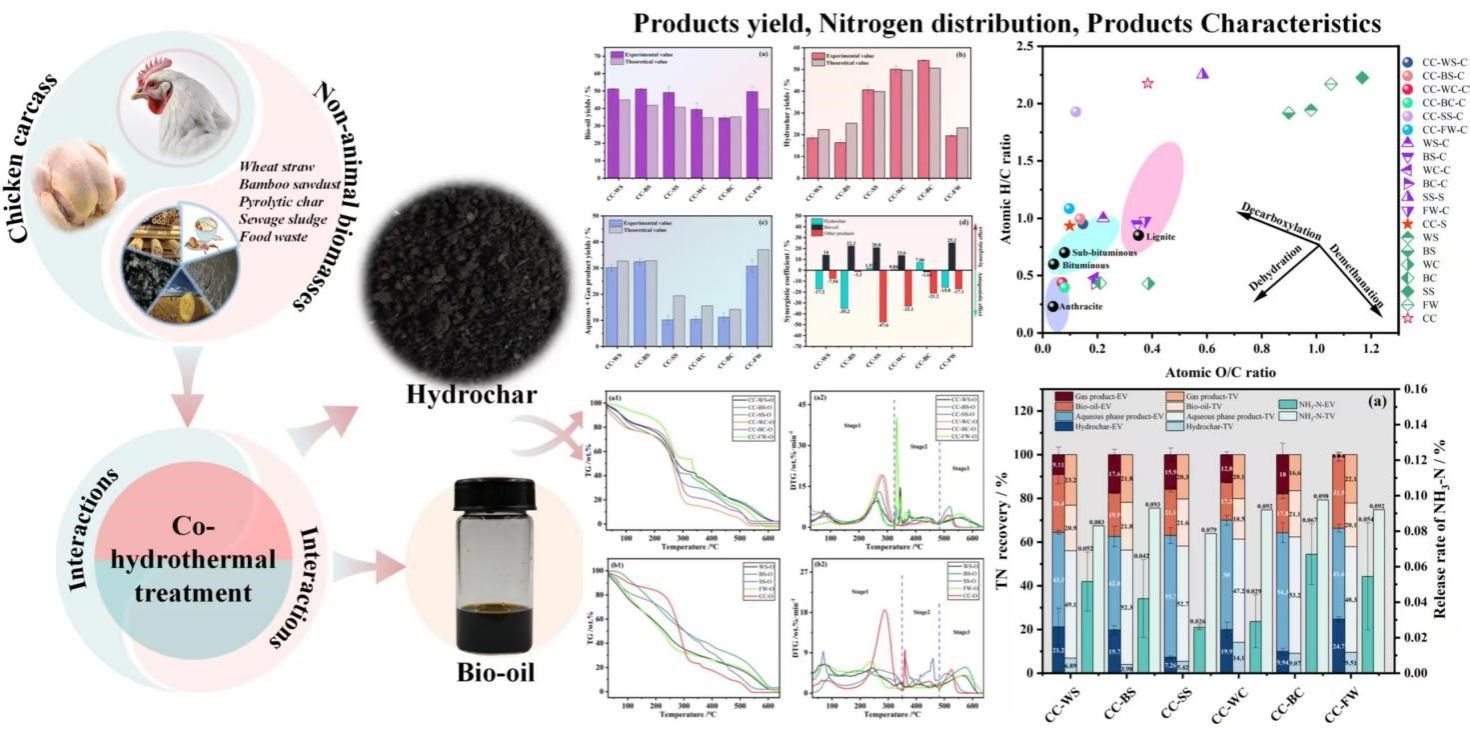 袁巧霞教授和牛文娟副教授课题组在病死畜禽与不同非动物基生物质共水热转化处理技术领域取得新进展,相关研究成果以“Co-hydrothermal treatment of chicken carcass and non-animal biomass for cleaner production”为题在Chemical Engineering Journal发表。该研究报道了一种利用病死畜禽与非动物基生物质共水热转化处理实现清洁生产的工艺方法,探索了病死鸡与不同非动物基生物质共水热时对生物油和生物炭产量的协同效应,揭示了总氮迁移转化规律(尤其是抑制游离氨释放的情况),分析了共水热转化处理后生物炭和生物油的基本理化特性以及生物炭结构性能、吸附性能的变化特征,解析了共水热转化处理对生物油和生物炭燃烧性能的作用机制。