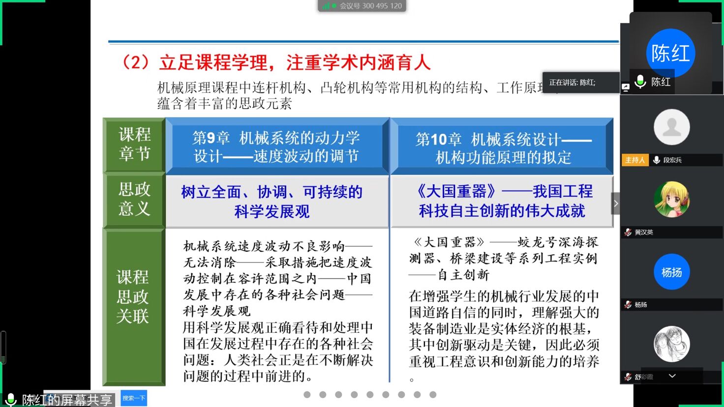 “课程思政”创优行动计划,4月30日下午4:30,机械系教工党支部举办“课程思政建设”主题党日活动,晚上7:30又特地邀请主持学校“课程思政”示范建设项目的陈红、宗望远、李旭荣等3位老师来到腾讯会议直播间接着就如何开展“课程思政”进行分享交流。