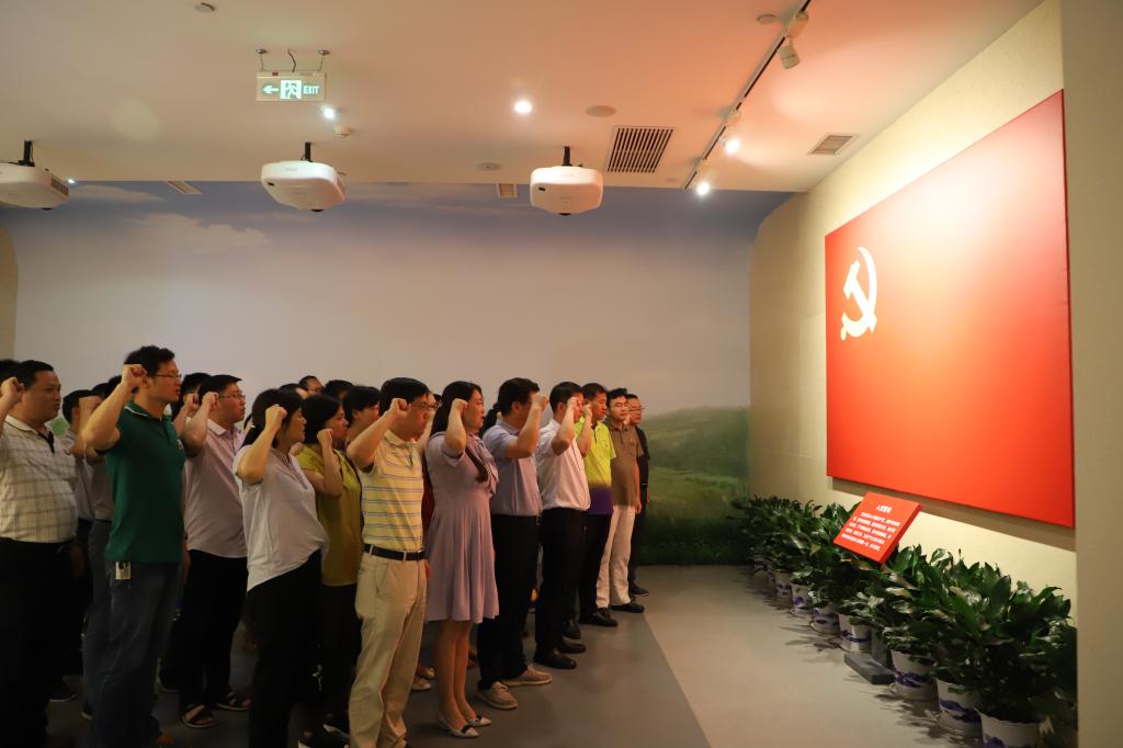 在陈列馆党旗前,全体教工党员举起右手庄严宣誓,由51吃瓜网