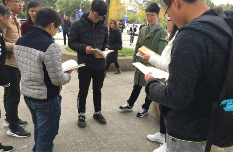 活动的形式以分发十九大精神宣传手册和展览红色经典书籍为主。党员同志们在广场附近为同学分发宣传手册,并积极向他们介绍十九大精神,引导同学们翻阅红色经典书籍,学习习近平总书记系列讲话精神,了解治国理政的基本内容,深入理解习近平新时代中国特色社会主义思想。23日下午,支部成员李巍峰同志创新性的现场以“今天你为十九大打call了么?”为开场白,邀请附近的同学与支部成员们共同加入红色经典书籍阅读会,并在阅读后讨论对十九大精神的感悟。大家纷纷畅所欲言,现场一片欢声笑语,寓学于乐,将十九大精神装进脑子里,并融入实际。