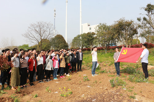 活动最后,在辅导员刘琛老师的组织下,参加植树的所有人员进行合影留念。并且机电1302班汪哲同志带领党员们一起在党旗前重温了入党誓词,宣读了毕业生党员的倡议书,让大家始终铭记自己党员身份。
