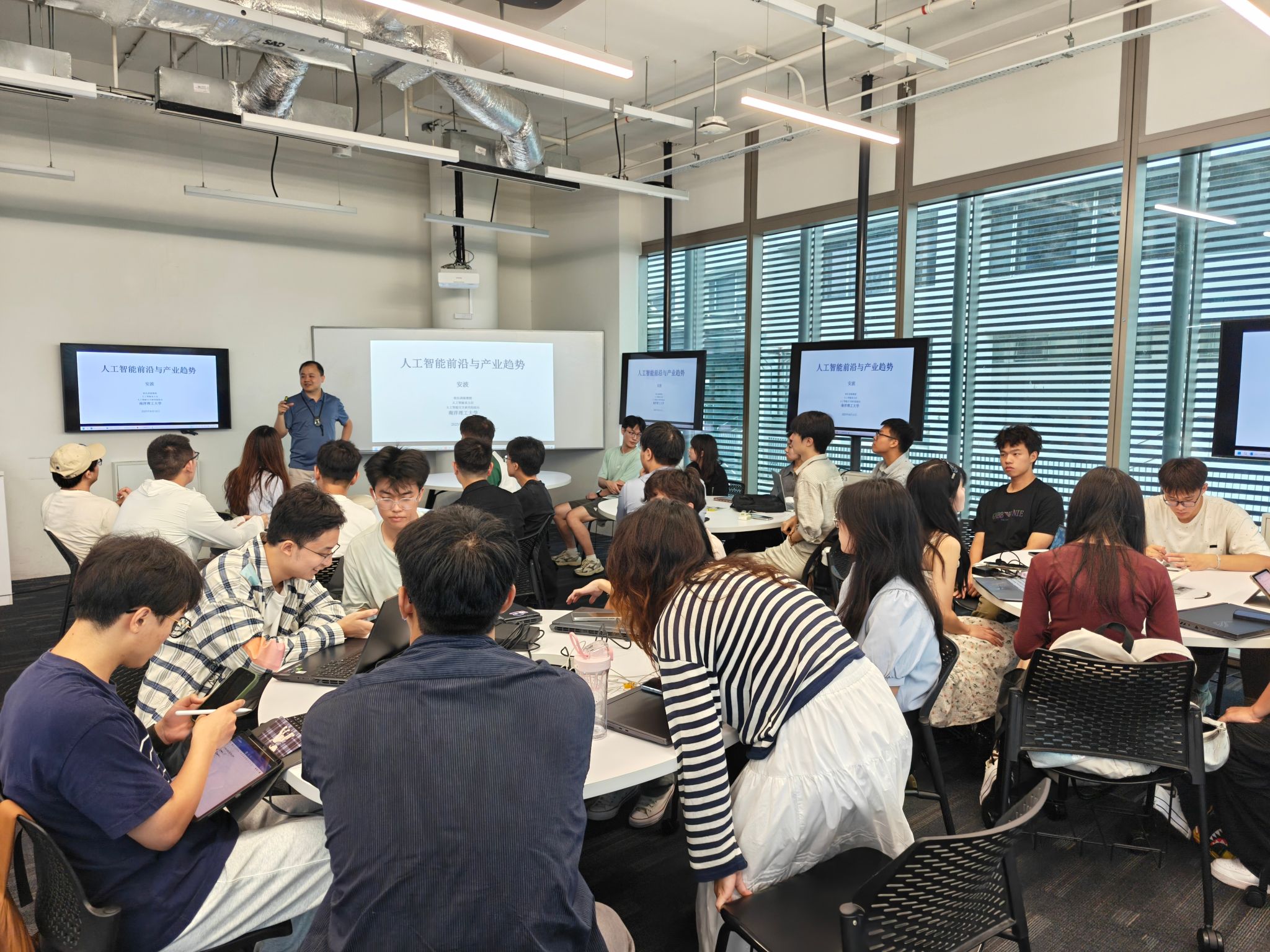 南洋理工大学的课堂是此次研学的主阵地。8月11日起,同学们走进这所国际知名学府的教室,聆听新加坡工程院院士Danwei Wang、Prof. Bo An和Prof. Mohan 三位老师的精彩授课。