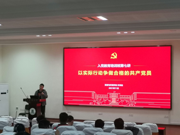 分党校在工程楼A111报告厅举办2021年下半年发展对象培训辅导报告,由资源与环境学院许泽远老师为全体发展对象带来题为《以实际行动做合格的共产党员》的主题报告。