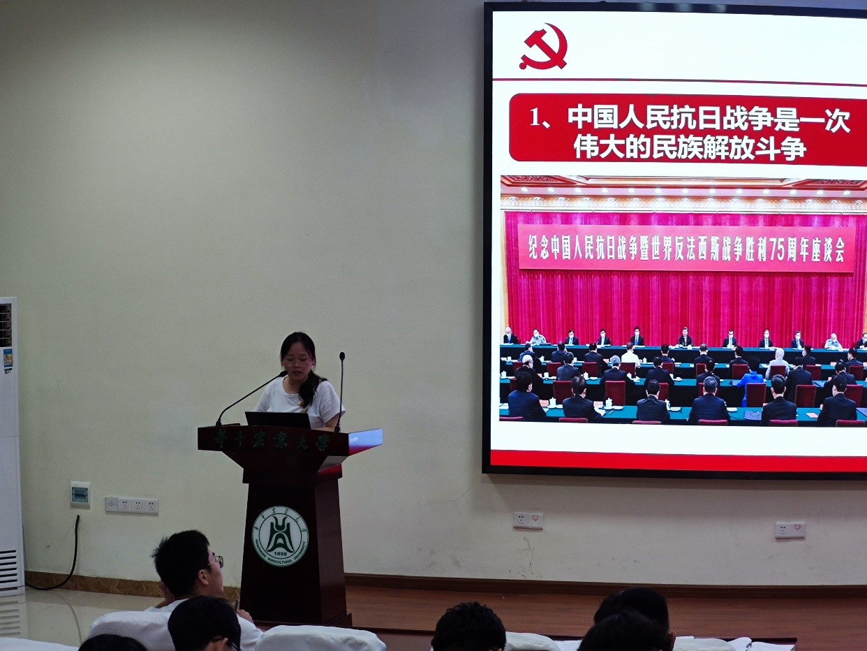 刘婷婷同志领学了习近平总书记在纪念中国人民抗日战争暨反法西斯战争胜利75周年座谈会上的讲话。她谈到,中国人民抗日战争是一次伟大的民族解放战争,战争的胜利彻底粉碎了日本军国主义殖民奴役中国的图谋,捍卫了国家主权和领土完整,开启了古老中国凤凰涅槃、浴火重生的历史新征程。她讲述了今日中国实现中华民族伟大复兴的关键举措,即在党的领导下,坚持中国特色社会主义道路,以人民为中心,坚持斗争精神,坚定不移走和平发展道路。