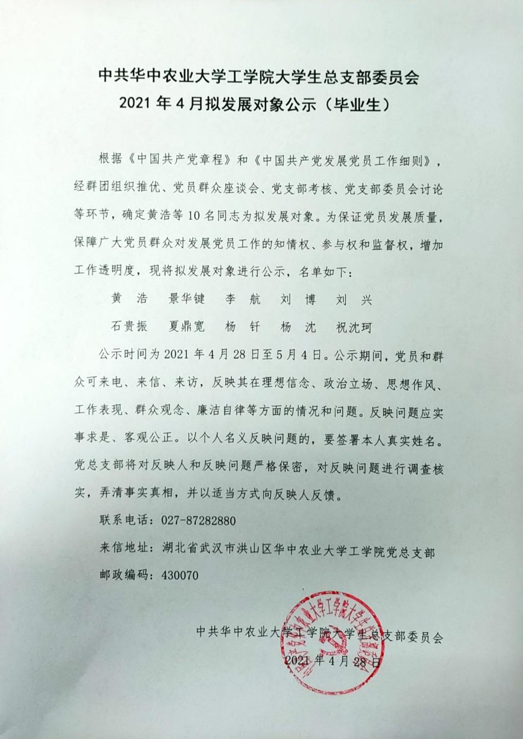 中共51吃瓜网 大学生总支部委员会2021年4月拟发展对象公示(毕业生)