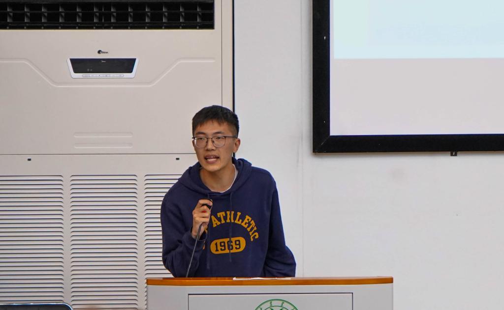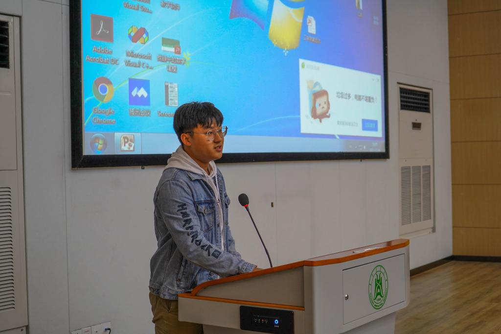 优秀学生干部李自拓从成绩、科研经历和社会工作进行了自己的分享。李自拓通过分享学习数学建模的过程,告诉同学们要做一个真实且自新的自己,从真实到自信。李自拓也向同学们聊了自己的心路历程,他说:“未来未知,要趁现在把握自己。生命是一个长期积累的过程,并不会因为某一件小事而改变很多,所以要时时刻刻的努力,踏踏实实的进步。希望同学们做一个懂生活,并且享受生活的人。”
