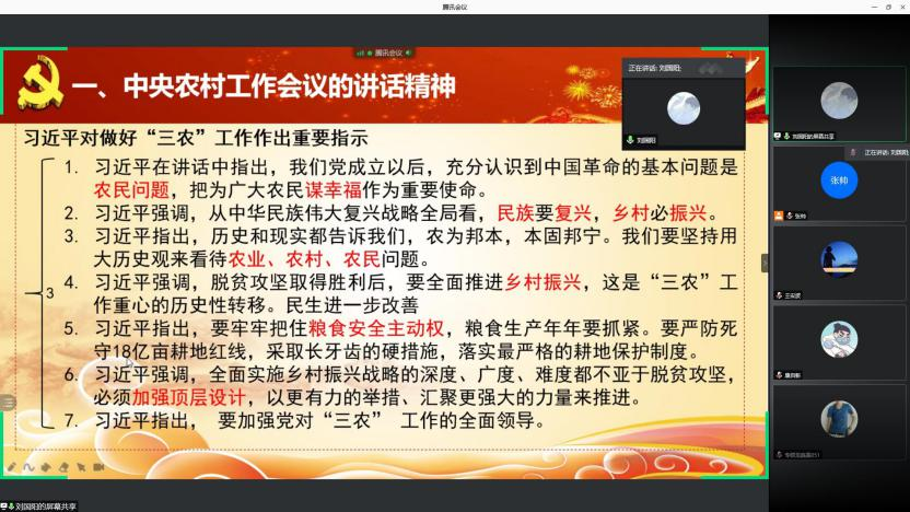 刘国阳同志、吕文同志分别在线上开展领学活动。刘国阳同志说,中央农村工作会议再一次将“三农”问题摆到关系国家长治久安的重要位置,习总书记在讲话中指出,我们党和国家充分认识到农民问题的重要性,把乡村振兴放到民族复兴的战略全局当中,以大历史观看待“三农”问题。习总书记进一步强调了粮食安全主动权,严防死守18亿亩耕地红线,严格落实耕地保护制度,同时强调要加强党对“三农”工作的全面领导。