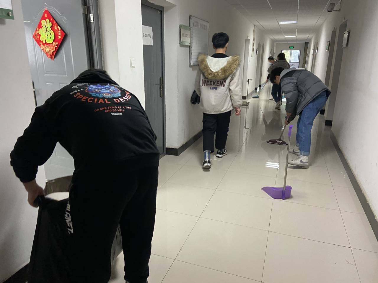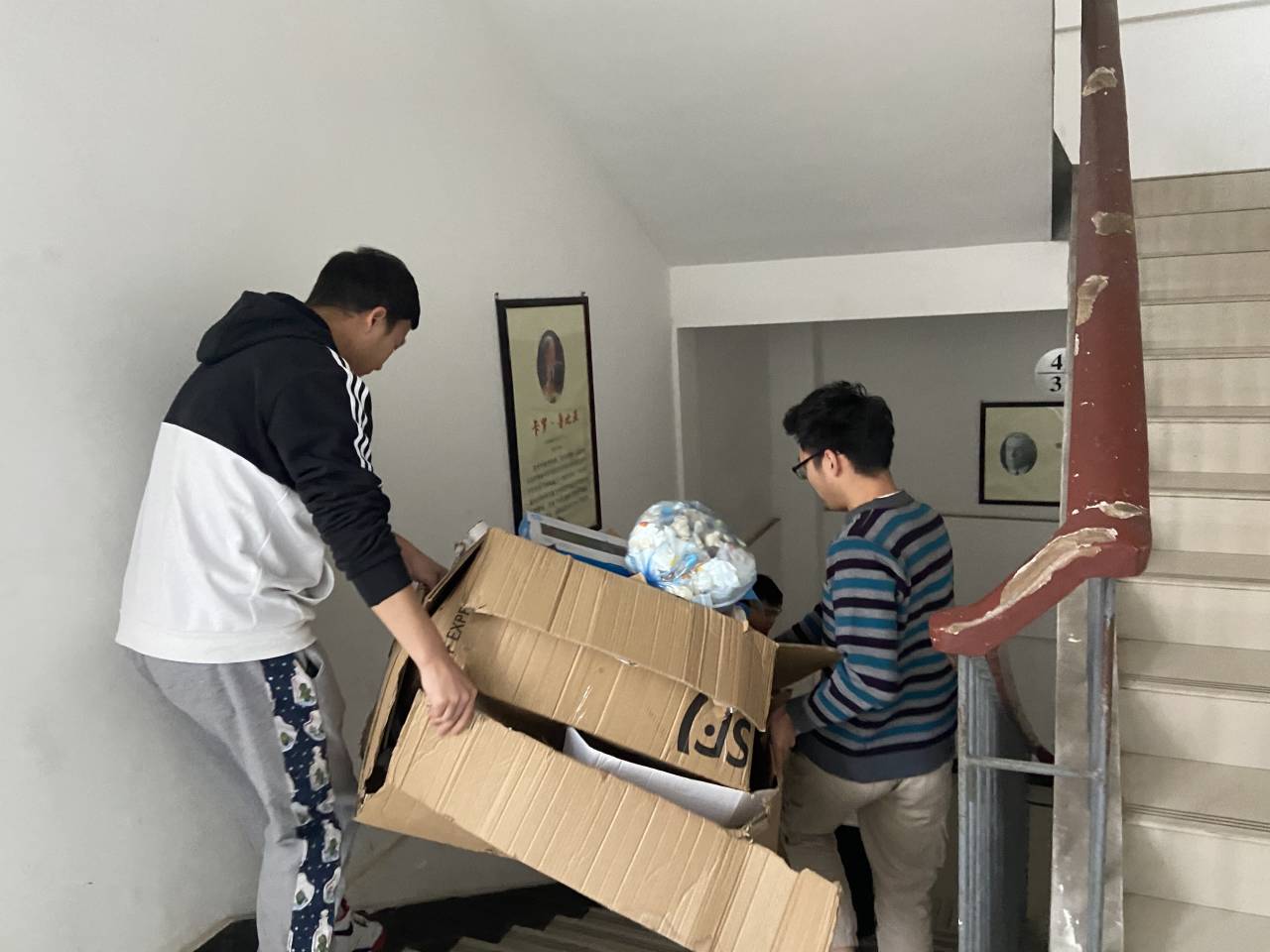 室内清扫结束后,大家积极配合学院保洁人员的工作,将清理出来的垃圾杂物一同搬运到楼下垃圾集中存放点。