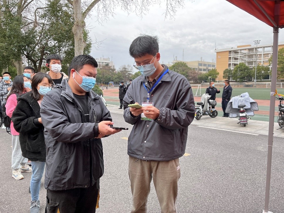 “请大家带好口罩,有序排队,提前打开‘武汉战役’小程序。”现任研究生党支部书记杨天圆在核酸检测现场负责秩序引导,志愿工作结束后,他分享到:“疫情防控关乎全校师生的安全和健康,能够在这个特殊的时期为校园疫情防控贡献一份自己的力量,我感到很荣幸。”其他志愿者也纷纷表示,虽然志愿服务的过程很辛苦很单调,但是想着自己是在助力疫情防控,为师生服务,就觉得一切都是值得的。
