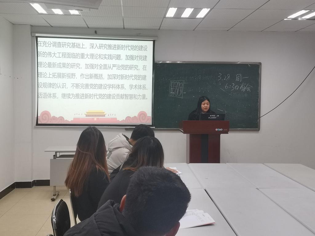 接着,马逸霄同志领学习近平总书记对党的建设研究工作做出的重要指示时引用习总书记讲话中“加深新时代党的建设规律的认识,继续为推进新时代党的建设贡献智慧和力量”的这句话勉励大家在这样一个新时代背景下要多思考,做事情要三思而后行,莽撞只会让自己碰壁而达不到最后所期望的效果。