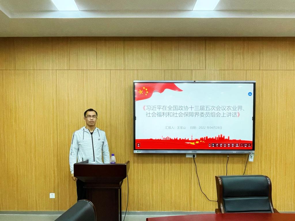 王宝山同志领学习近平总书记在全国政协十三届五次会议农业界、社会福利和社会保障界委员组会上的重要讲话,他谈到,社会福利和社会保障事关百姓福祉、社会公平,是治国安邦的大问题。作为一名学生党员,我们要时刻牢记习近平总书记的谆谆嘱托,努力提高自己为人民服务的本领,日常生活中主动关心身边需要帮助的人,把人民是否真正得到实惠、人民生活是否真正得到改善、人民权益是否真正得到保障作为衡量一切工作成效的标准。