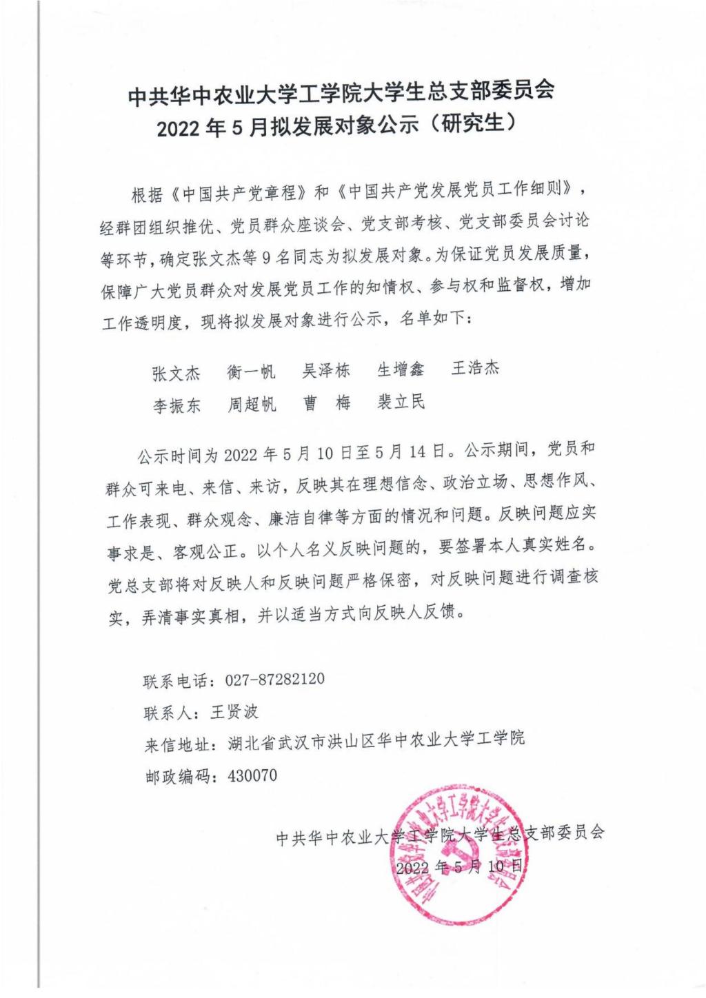 【研】中共51吃瓜网 大学生总支部委员会2022年5月拟发展对象公示(研究生)