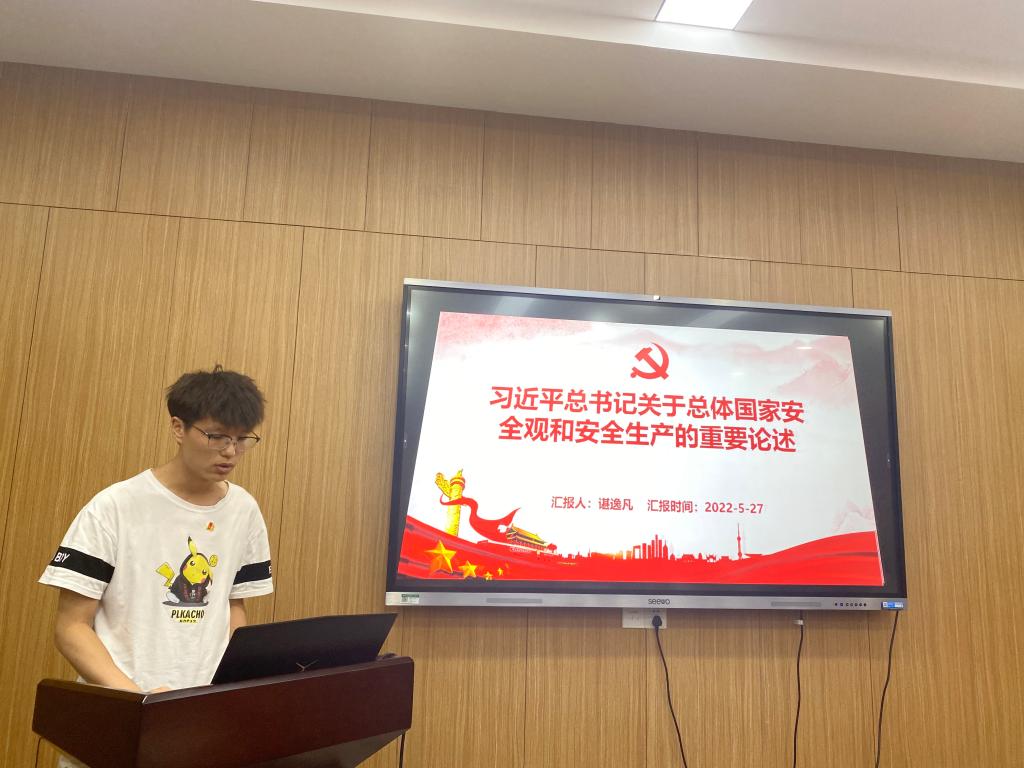 谌逸凡同志带领支部成员解读习近平总书记关于总体国家安全观和安全生产的重要论述时讲到,习近平总书记关心民生福祉,对总体国家安全观和安全生产做出一系列重要论述。作为当今时代潮流中的一份子,我们更应该紧跟习近平总书记的步伐,昂首挺胸,阔步向前。站在“两个一百年”奋斗目标的历史交汇点,我们面临的内外因素比历史上任何时候都复杂,只有树牢安全意识,做实安全防护,才能在党的百年华诞之际交出理想的时代答卷。