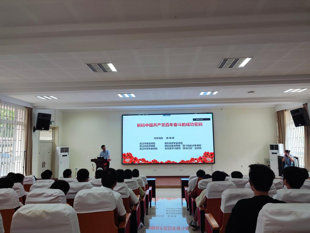 邀请武汉市委宣讲团、马克思主义学院陈明辉老师为研究新生作题为“解码中国共产党百年奋斗的成功密码”党史学习教育讲座,旨在引导新生更加坚定理想信念,激励新生以奋进姿态喜迎党的二十大胜利召开。