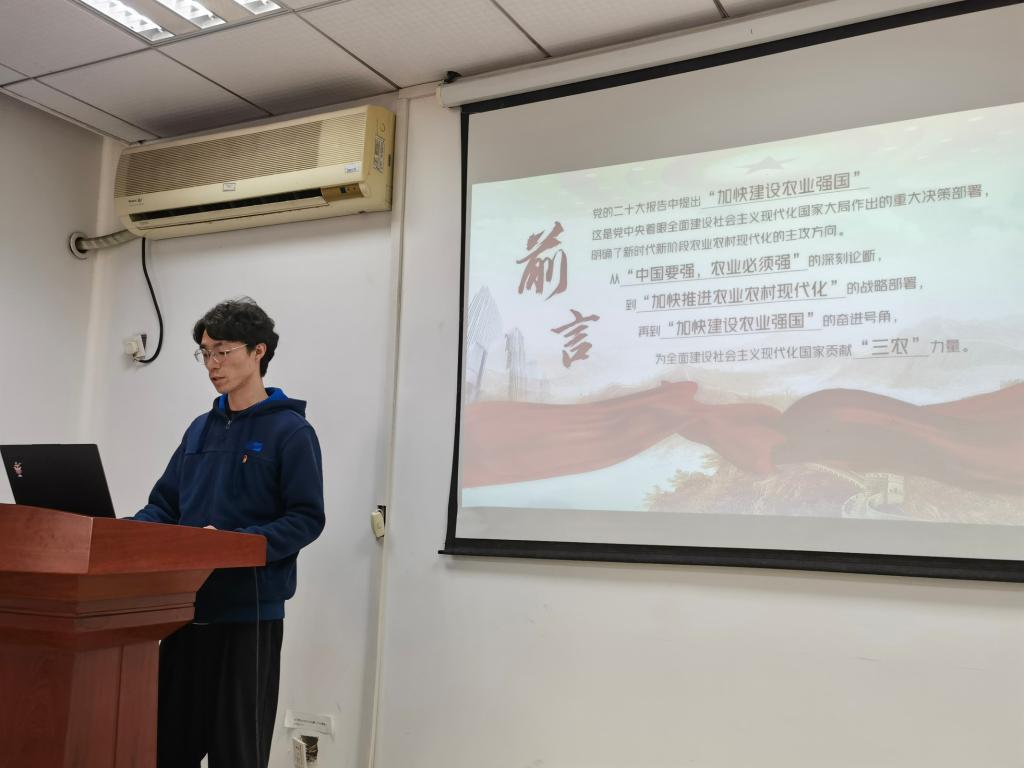 曹清同志领学党的二十大报告中“加快建设农业强国”相关内容。他谈到,正如习近平总书记所讲的,要坚持把解决好“三农”问题作为全党工作重中之重,举全党全社会之力推动乡村振兴。我们当谨记总书记的嘱托,努力学习贯彻党的二十大精神,坚定建设新农村信念,结合自身专业背景和社会需要,努力在推动农业质量变革、效率变革、动力变革,在改造传统农业到建设现代农业转变的道路上洒下我们华农人的汗水。