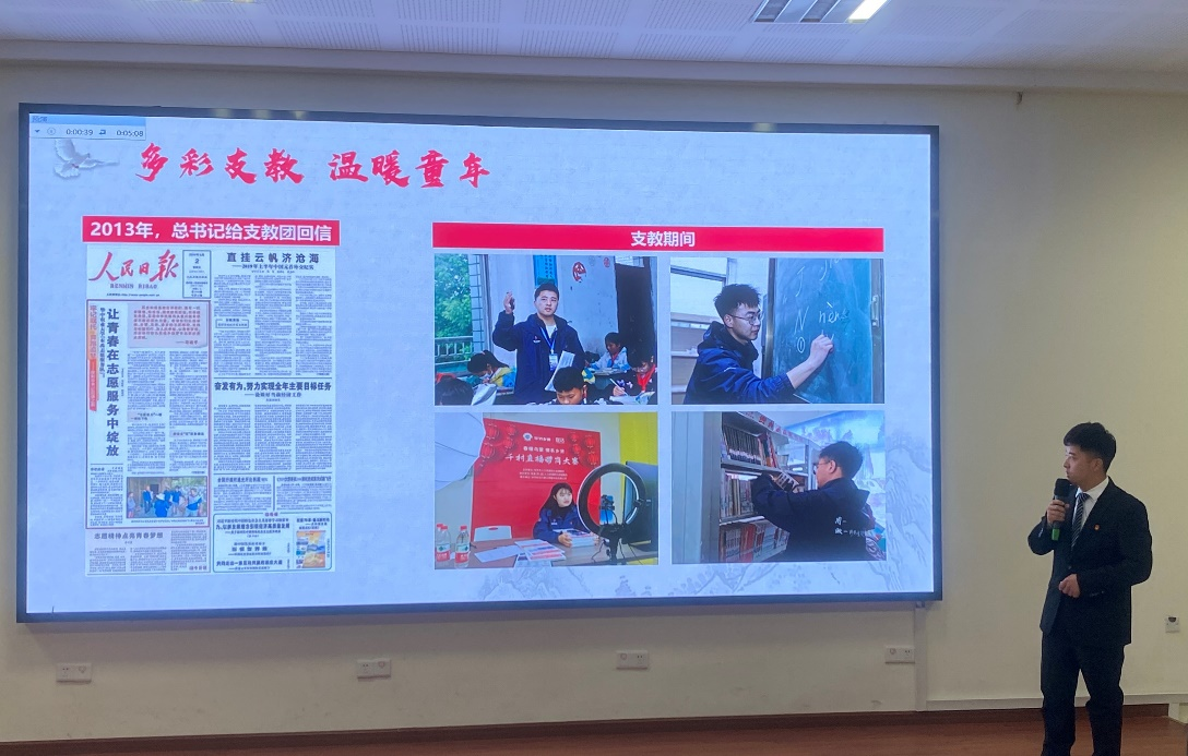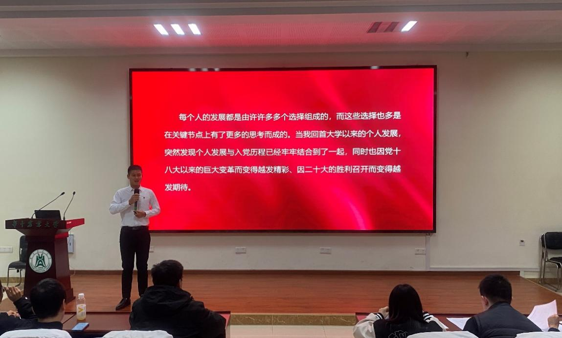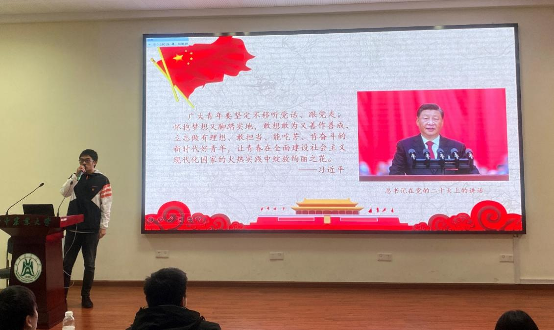 “当我回首大学以来的个人成长经历时,突然发现个人的发展与入党历程紧密相关。”油菜机械化生产技术与装备研究生第一党支部的杜文斌回顾了学生工作、基层扶贫、乡村支教、防疫志愿服务等成长历程,他通过铿锵有力的入党誓词和一个个动人心弦的革命故事分享了自己对二十大精神的理解和感悟,同时鼓励广大青年立志做有理想、敢担当、能吃苦、肯奋斗的新时代好青年。