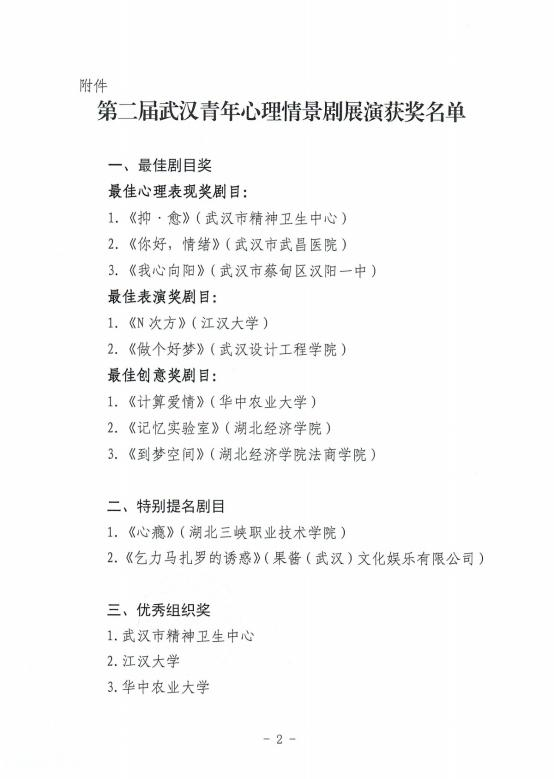 9月28日,武汉市社会心理服务行业发布公告,“第二届武汉青年心理情景剧展演”综合专家打分及评审意见、大众投票结果和各单位参与积极性,评选出若干奖项,并经过公示期,最终确定获奖名单。51吃瓜网