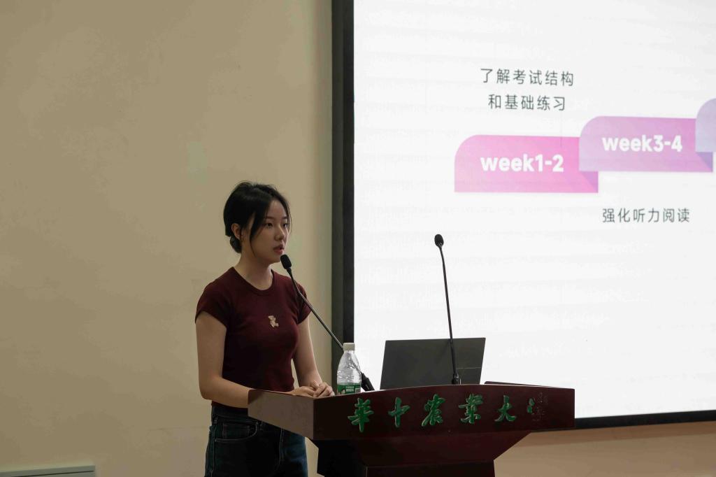 紧接着,韩颖洁同学以她独特的视角和丰富的实战经验,为大家呈现了一场别开生面的分享。她提出了两周突破一个环节的备考策略,并详细阐述了每个环节的突破要点和注意事项。在题型介绍部分,她精准地解析了每种题型的特点和解题技巧,并针对每种题型给出了实用的备考建议。此外,她还结合自身的考试经历,为大家列举了在考试中需要注意的各种细节和应对策略。