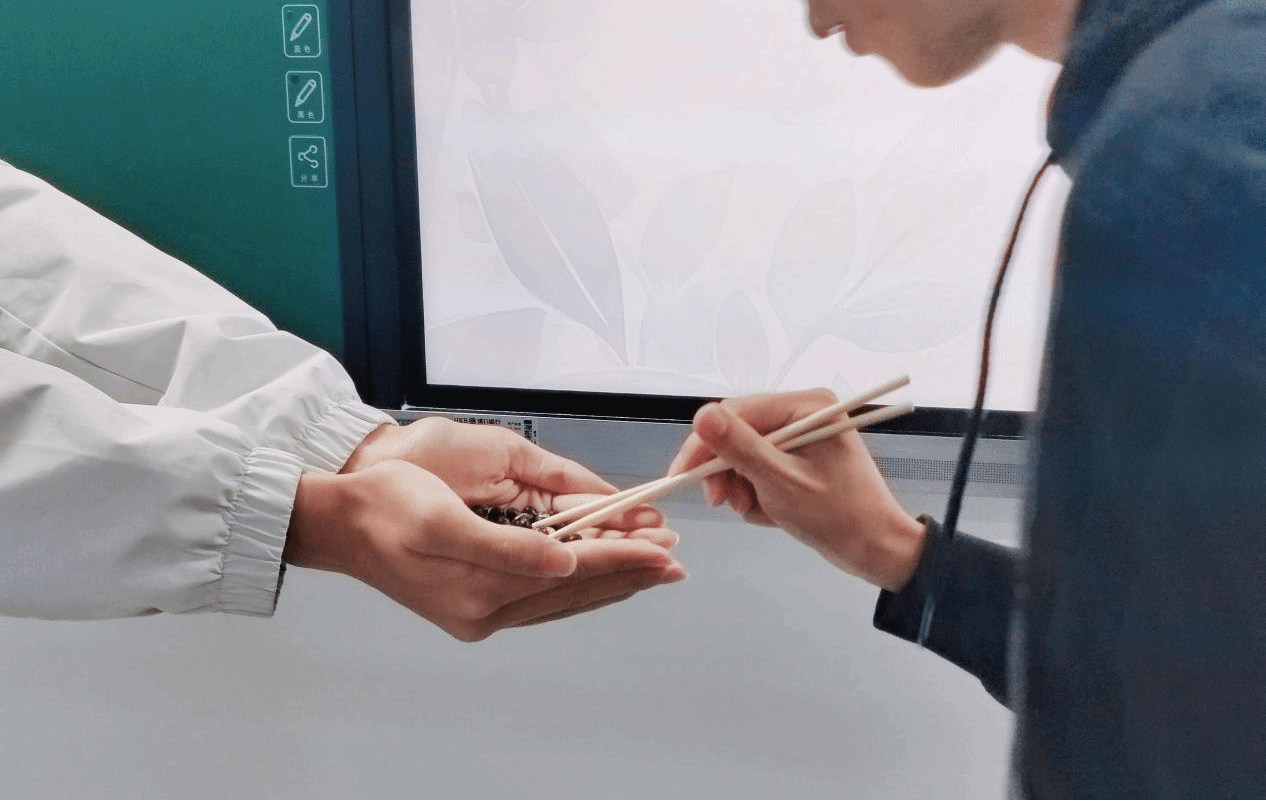 在模拟航天员训练 “手眼协作” 体验环节中,每个小组派出三名同学,其中一名同学用筷子在另外两名同学之间传递黄豆,限时两分钟。限时结束后,传递黄豆最多的小组获胜并获得积分。在紧张的比赛过程中,同学们充分体验到了模拟训练的难度,也深刻体会到了航天员们在训练中所需的高度专注和协作能力。大家深刻地领悟了载人航天精神中 “特别能吃苦、特别能战斗” 的内涵,伟大的载人航天精神也将激励大家在面对困难时学会勇往直前。