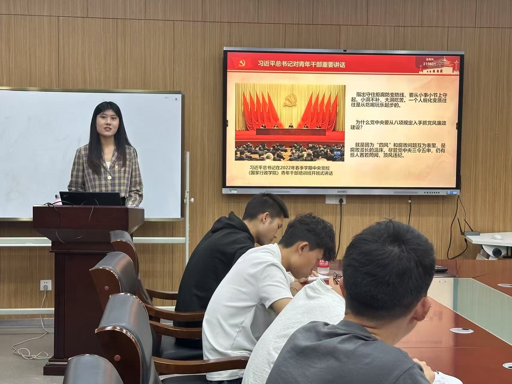 油菜机械化生产技术与装备研究生第一党支部于新工科楼G330开展“把牢听党话跟党走青春航向,在中国式现代化建设中挺膺担当”主题党日活动,旨在深入贯彻中央八项规定精神学习教育,引领全体党员以更高标准、更严要求、更实作风推动支部建设,以青春作为助力中国式现代化建设。