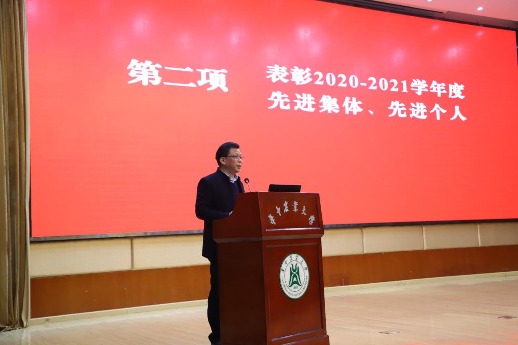 院长廖庆喜教授宣读表彰文件,他指出,一直以来,全院大学生高举中国特色社会主义伟大旗帜,牢记习近平总书记“与祖国同行、为人民奉献”的嘱托,积极践行社会主义核心价值观,树立为中华复兴而读书的远大志向,不断提升社会责任感、自主学习能力、实践创新能力和全球胜任力,涌现出了一批先进集体和个人。学院决定对获得先进的集体和个人进行表彰奖励。