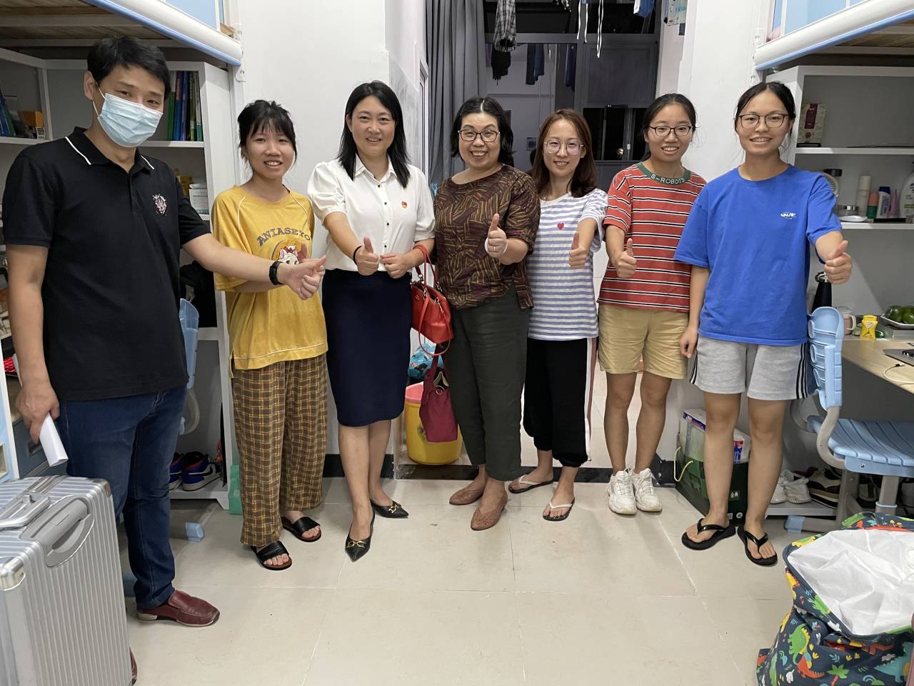 在荟园21栋A栋六楼女生宿舍走访时,学院党委副书记瞿明丽和导师代表袁巧霞教授、晏水平教授挨个走进新生宿舍,询问同学们是否收拾好行李安顿下来,是否遇到困难,是否适应校园生活。老师们不仅关注到宿舍储物空间、床垫厚度等生活方面的小事,还鼓励新同学们营造良好的宿舍环境和氛围,积极锻炼,为接下来的学术生活提供坚实的基础。在走访过程中,老师们发现624宿舍的四个同学本科也是一个宿舍。瞿明丽在感叹她们的缘分之余,还赞扬了她们团结友爱的精神和为共同目标而努力的决心和毅力,希望她们能够将这样美好的品格继续保持下去。“来,同学们,我们一起拍个合影吧。”在与同学们深入交流后,瞿明丽提议导师代表与新生进行了合影留念。