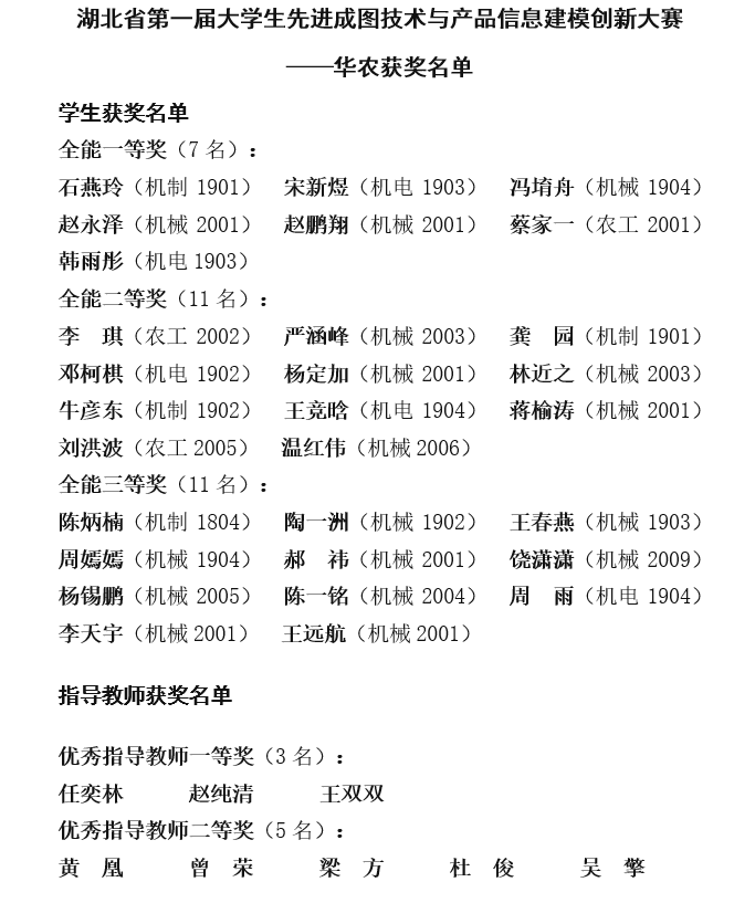 学子取得优异成绩,获得个人全能一等奖7项,二等奖11项,三等奖11项,指导老师任奕林等获得“优秀指导教师奖”。其中荣获一等奖和二等奖的18名学生将晋级第十四届全国大学生先进成图技术与产品信息建模创新大赛。
