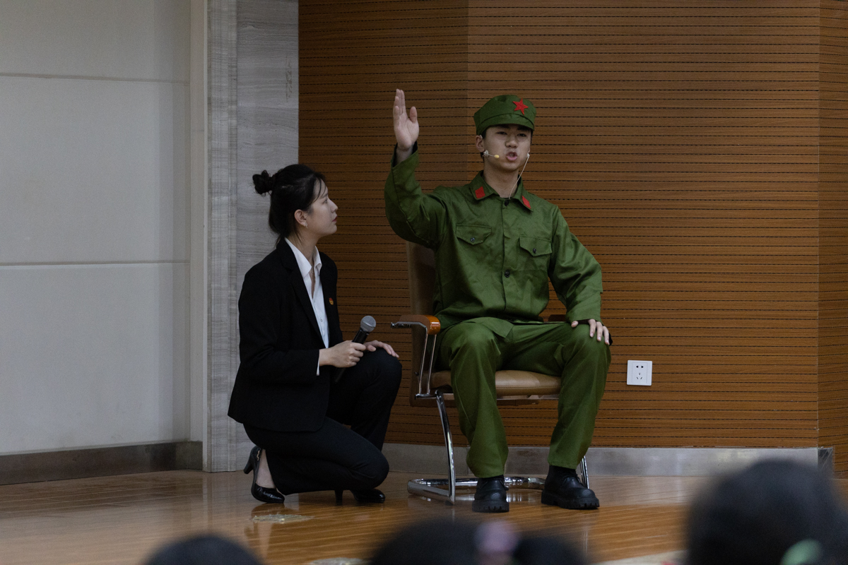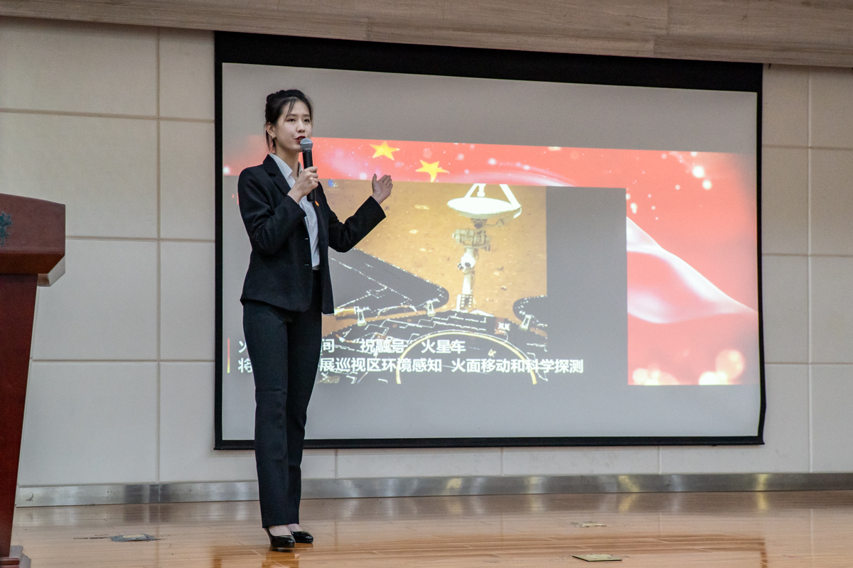 廖婷以《品大国重器,担青年使命》为题目进行演讲,从我国核武器、航空航天、海下勘探、海防事业的发展出发,赞颂了老一辈科学家攻坚克难、淡泊名利的精神。在理论学“习”我来讲环节,廖婷以“中国航母之父”刘华清将军的海军强国梦为话题,通过“穿越时空对话”的形式,讲述了共和国国防事业从艰难起步到蓬勃发展的历程,发出“青年一代当勇担时代使命。”的号召。