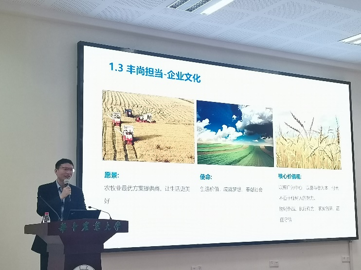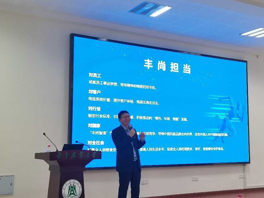 会议开始,唐平华通过一段视频让同学们快速了解饲料装备工程行业,通过详细数据说明行业发展的潜力。随后,唐平华重点介绍了公司发展历程、文化传承与价值追求,介绍了公司在行业中的领先地位和发展优势,同时对本校校友的突出贡献表示肯定。