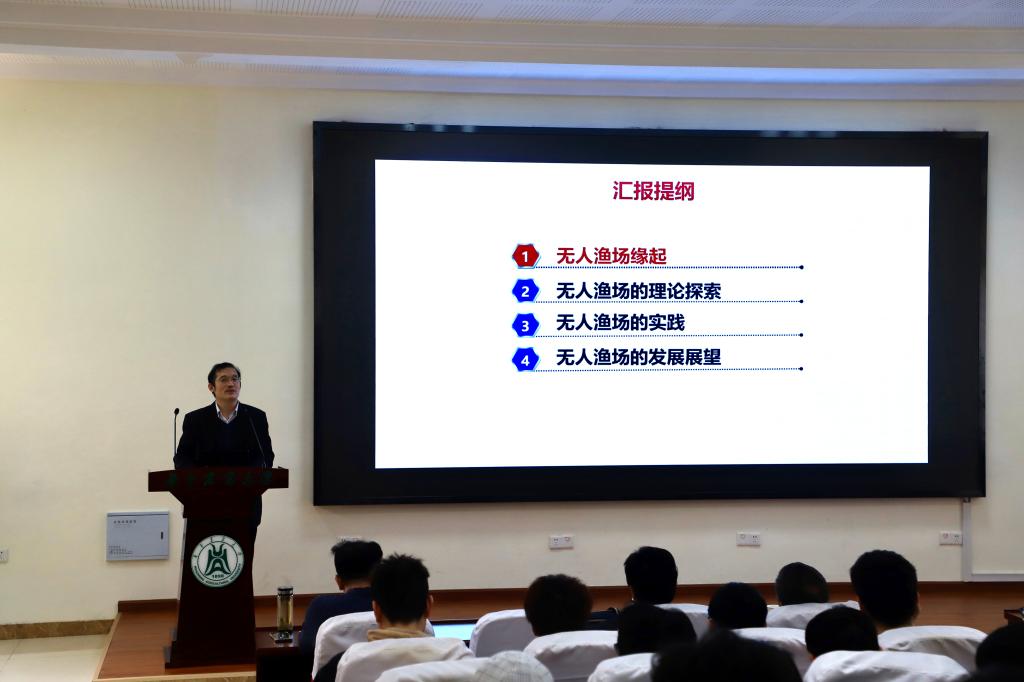 李道亮教授从无人渔场的缘起、理论探索、实践和发展展望等四个方面向在场师生分享了无人渔场的发展历程和现状。他谈到,我国渔业生产劳动生产率低、劳动力成本增加、养殖环境恶化是目前制约我国渔业生产发展的最大桎梏,渔业要实现长期稳定健康可持续发展,就必须转型升级,迈向数字化、网络化、智能化、无人化的新阶段,大力发展无人渔场。