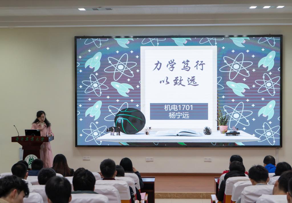机电1701班杨宁远从“力学、笃行、致远”三个方面分享了自己的经历:“力学”是指在学习过程中严谨认真的态度和“不放过任何一个细节”的工匠精神,“笃行”是各项比赛时不厌其烦地机械结构大改、程序改动和实物调试,最终,以优秀的学习成绩、五项专利、三项国家级奖项等出色成果得以“致远”——保送至浙江大学直接攻读博士。