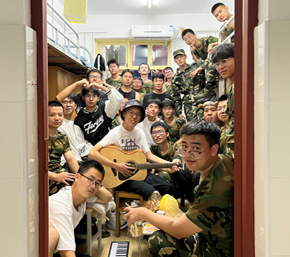 机械2209班学班张晨昊、下班丘志峰为每一位小班买了果茶,一起坐在操场上看吉他协会演出。赏月的同时,两位学班下班与小班谌吉彬同学合唱,现场充满了欢声笑语,掌声不断,格外温馨。丘志峰说道:“大家比刚见面的时候少了几分羞涩,变得愈发热情、团结,班级也渐渐有了家的感觉!”