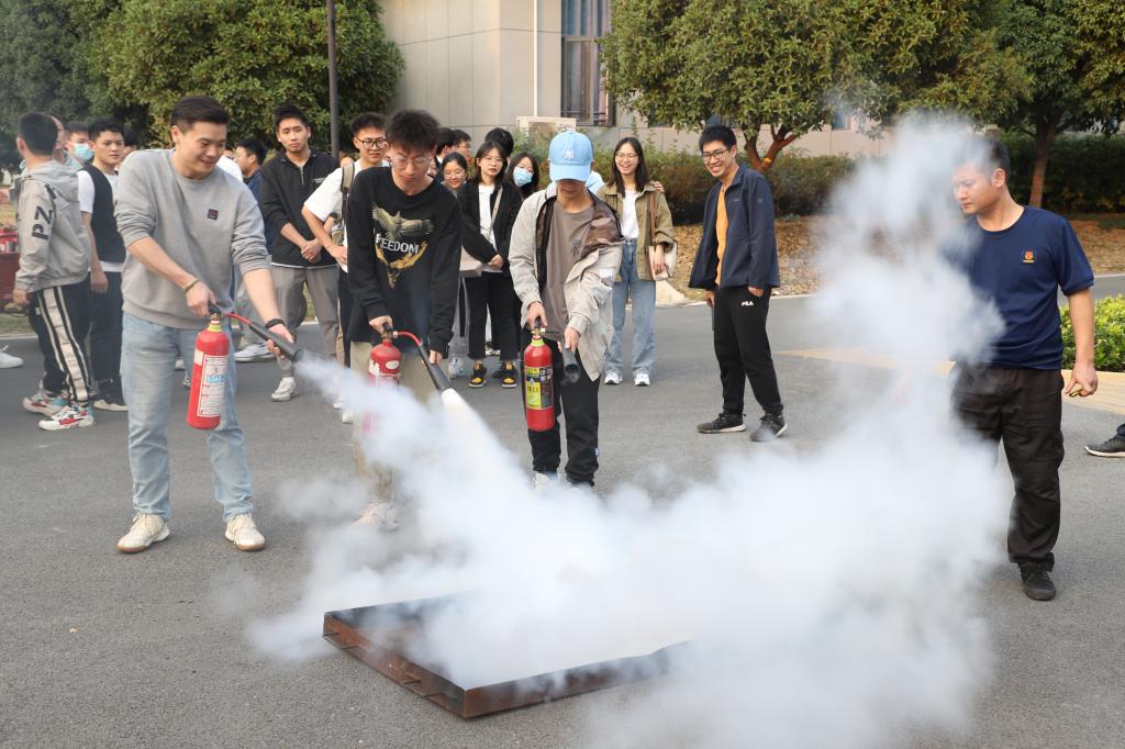 培训结束后,参会师生在新工科大楼旁进行消防安全现场演练。建安部负责人向师生介绍了灭火器的使用方法,并设置模拟“火场”,手把手指导师生进行“灭火”实战,学习掌握灭火技能。