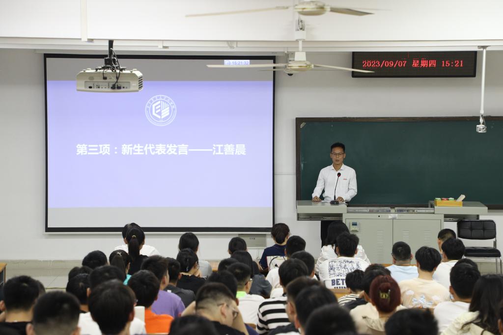 现代农业装备工程专业江善晨作为博士研究生新生代表发言。他回顾自己本科毕业工作一年后返校求学再到转博的心路历程。他以导师牛智有教授的教诲与新生共勉,一是“学习知识长本领”,要通过不断地自主学习和独立思考,达到从量变到质变的突破。二是“学习他人长能力”,在科研学习中要虚心向其他师生学习,取长补短,不断补齐短板。三是“反省自己长智慧”,要时常回头审视自己的科研内容和课题进度,不断总结反思,脚踏实地行稳致远。