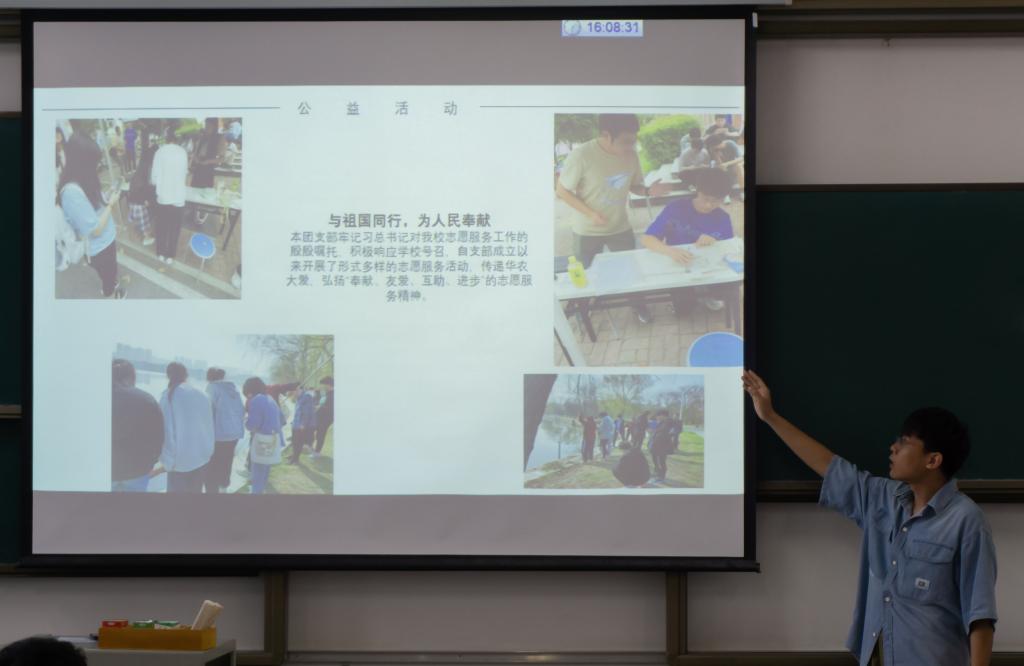 在四教B413教室里,农工2203班团支书薄程远带领班级同学一起总结过去一年班级的学习成果。该班级致力于提升班级成员的社会责任感和公益意识,屏幕上同学们参与集体自习、团生会、学雷锋活动、果园帮工等志愿服务活动等场景一一浮现,班级同学也纷纷上台分享学年收获。“新学年我们依旧要提升班级志愿服务活动质效,以切实行动传递爱心。”农工2203班王荣表示。