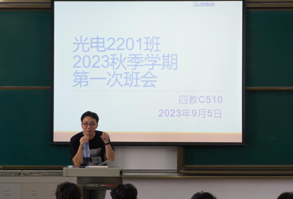 光电2201班主任罗亮从自身的生活经历讲起,以《“碎片化”的囚笼:新时代的大挑战》为题,向同学们谈起了生活中的各类“杀时间”陷阱,劝勉大家珍惜时光。罗老师倡导同学们从过去的成绩中抽离出来,着眼于现在和未来,脚踏实地稳扎稳打,通过加入实验室、课题组进行创新性研究,从而不断地学习专业知识,提升自身能力。