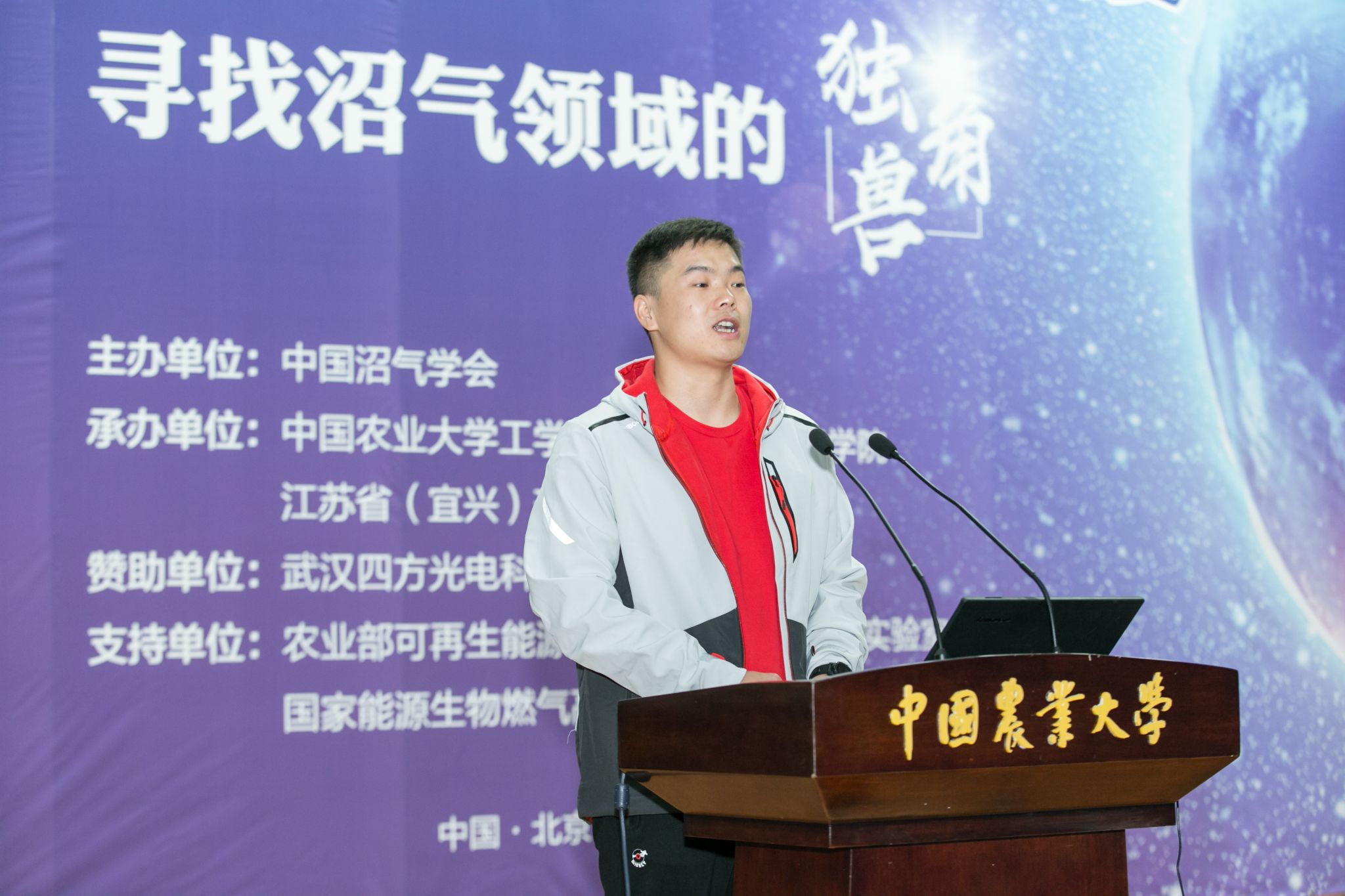 ▲晏水平教授鼓励学生参加学科竞赛,图为博士研究生梁飞鸿在比赛中作汇报(受访者 供图)