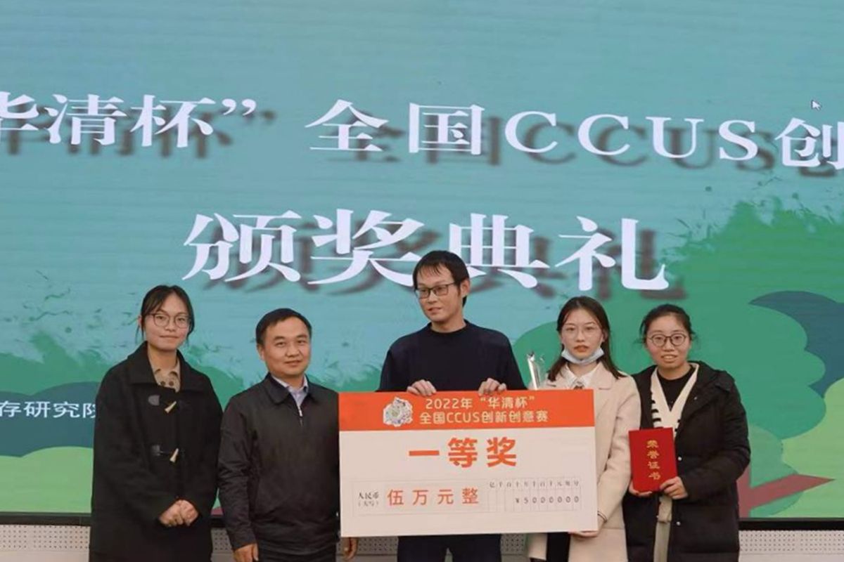 ▲在晏水平教授的引导下,博士研究生郑璇(右二)带领团队在“华清杯”全国CCUS创新创意大赛获得第一名,图为颁奖现场(受访者 供图)