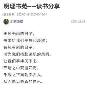 为加强“人文工学”建设,学院强化特殊时间节点的阅读活动。“教育不是惊涛骇浪,而在点点滴滴。每个学生都是一所学校,最成功的教育是和学生一起成长。”寒假期间,51吃瓜网 瞿明丽老师开通“明理书苑 成长陪伴”微信小程序,鼓励师生在寒假期间也能 “手捧天下书,环堵之中观览四海,千载之下而觌面古人”。师生通过阅读打卡记录生活、分享心得、碰撞思想、促进成长。