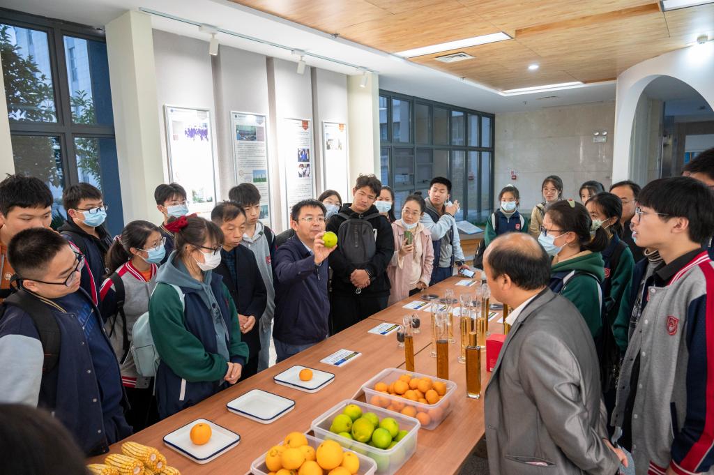 在介绍科技成果转化的实物展台,严校长拿起一枚伦晚脐橙对师生们谈到:“别看这一个小小的橙子,里面孕育着几代科研人的智慧结晶,正是我们前辈的不懈努力,才让我们一年四季都有橙子吃。”严校长鼓励大家立志投身农业研究,他指出,“农业科技也是重大科技,有很多值得大家探索研究的地方。大家要找准目标方向,做好定位,努力做行业的领军者。”参观结束后,严校长将作物遗传改良重点实验室成立二十周年纪事《激扬与追求》一书赠予崇阳一中学子们,“大家要多读书,不断提升人文素养,让自己变得有思想、有品位、有内涵。”
